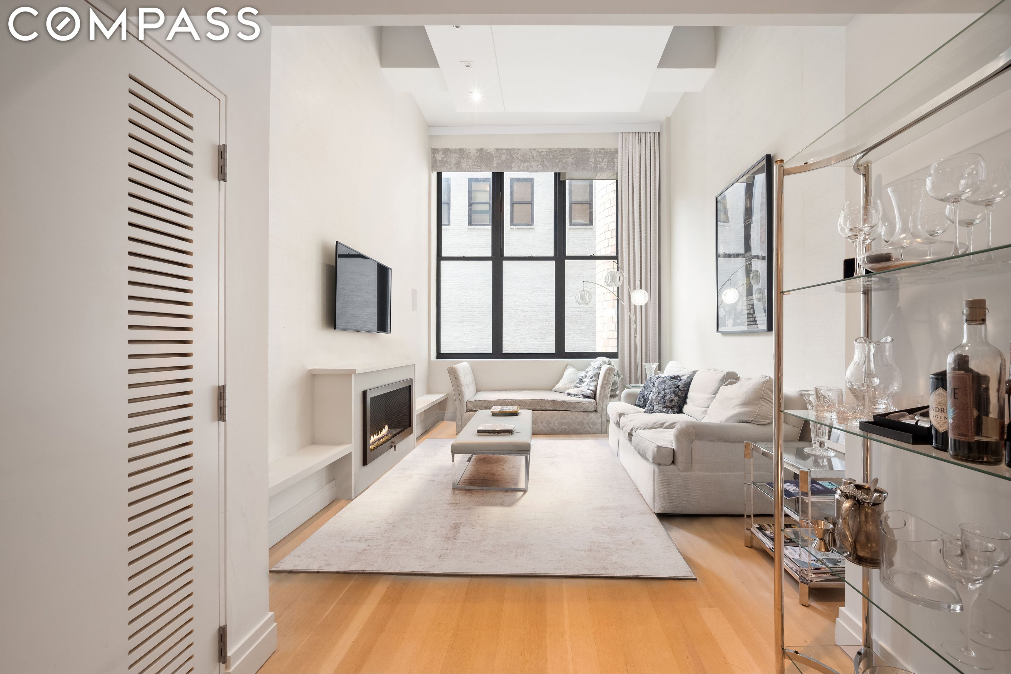 The main level of this stylish duplex enters a state-of-the-art kitchen with a Caesarstone countertop, generous custom cabinetry, and Subzero, Wolf, and Bosch appliances. An adjoining butler's pantry is meticulously finished as additional workspace and storage. The elegant living room featuring double-height ceilings stretches beyond the kitchen, providing surprising intimacy for such a grand space.