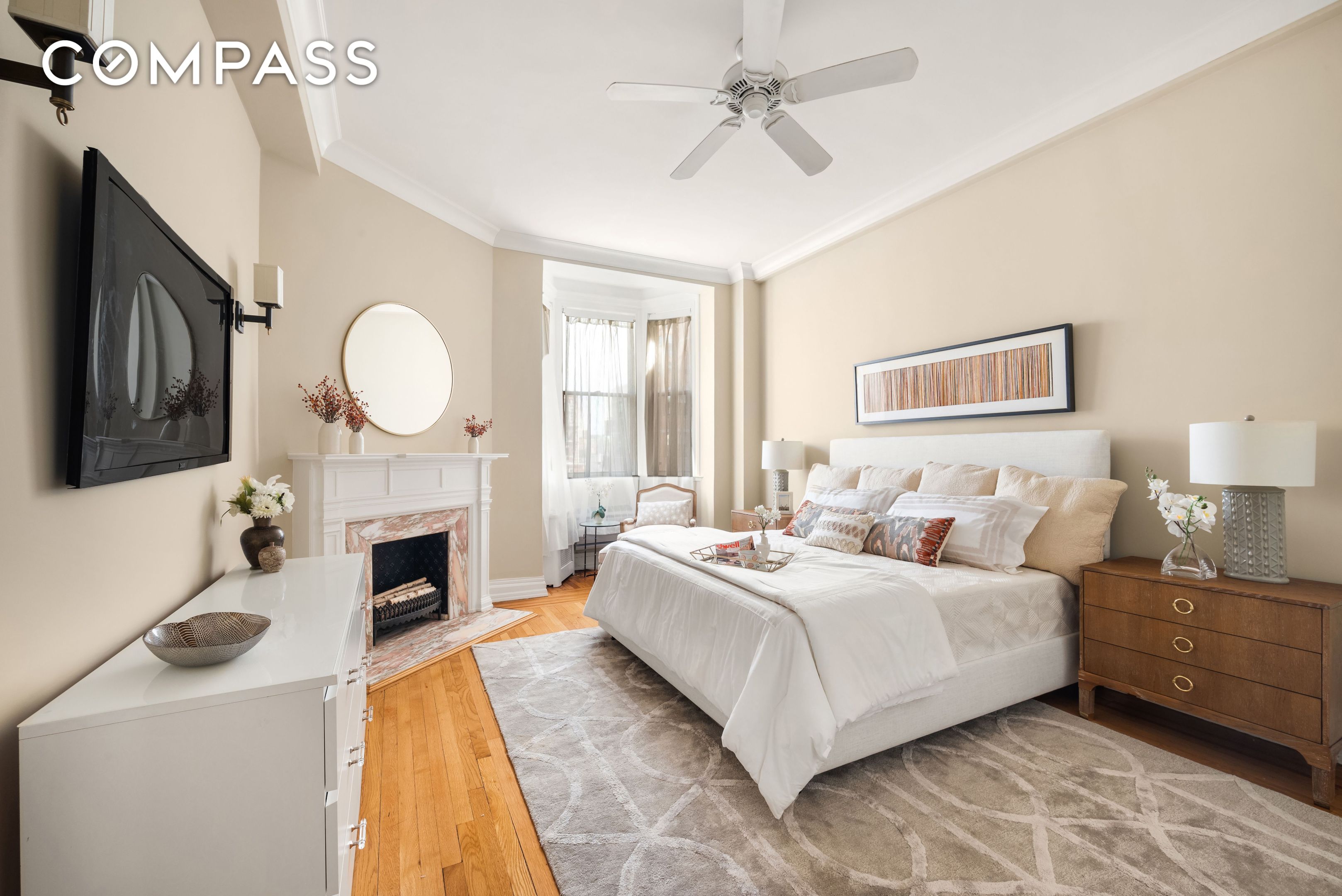 Step inside and be greeted by the warmth of hardwood floors that flow seamlessly throughout the home. The expansive living area is enhanced by large bay windows, flooding the space with natural light and offering captivating city views. A decorative fireplace adds a touch of charm and character to the living space.